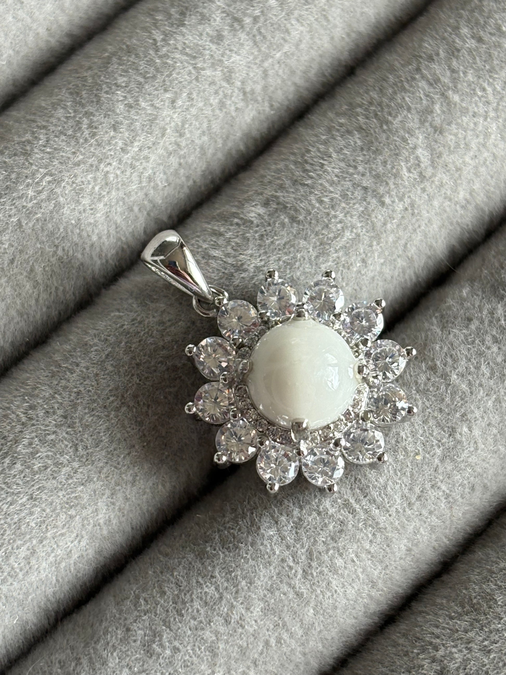 Encircling the stone, brilliant cubic zirconia stones shimmer like a crown, symbolizing the strength, grace, and beauty of motherhood. Suspended from a delicate 18-inch chain, this exquisite piece is available in sterling silver, as well as rose gold and yellow gold plating, offering a touch of elegance to suit any style.