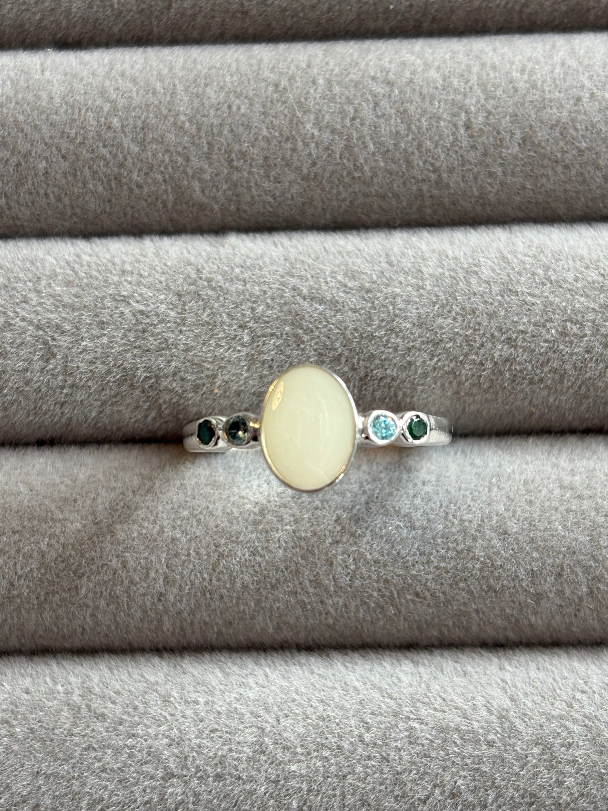 At its centre, a 6x8mm oval bezel cradles your keepsake stone, symbolising the unbreakable bond between mother and child. Framing this timeless keepsake, up to four customisable birthstones. Two grace either side of the keepsake stone. Each one representing a loved one, a milestone, or a moment you hold dear.