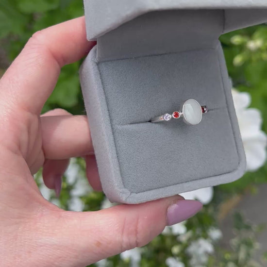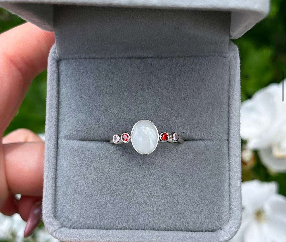A radiant celebration of love, connection, and cherished moments, the Evermore Birthstone Keepsake Ring is a breathtaking statement piece designed to hold your most precious memories close.