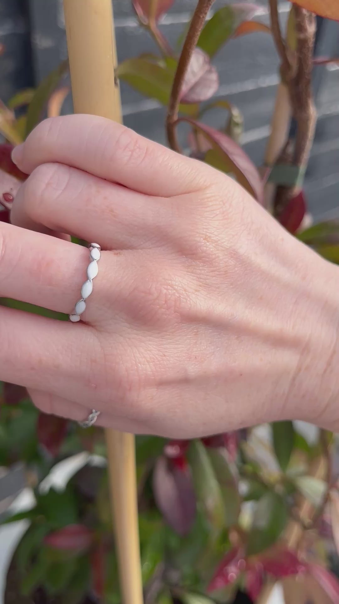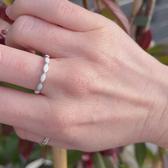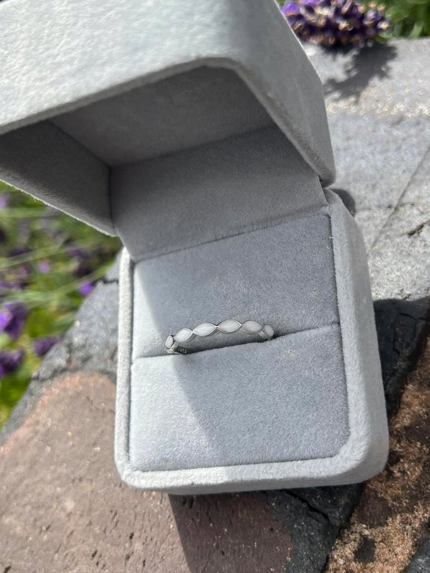 A sleek and practical design, perfect for those who need a ring that blends sentiment with functionality. This elegant half-band features marquise-shaped keepsake stones, creating a unique and eye-catching look while remaining smooth and unobtrusive.